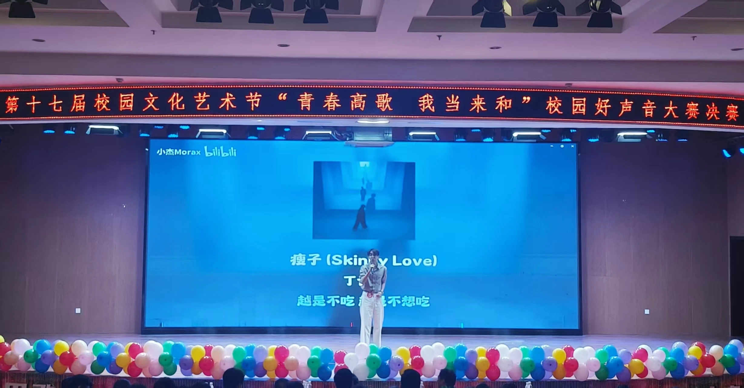 车轮战环节,奚浩然同学再次登台,带来歌曲《瘦子》。舞台上的他自信从容,台风沉稳大气,凭借独特嗓音与极具感染力的演绎,将歌曲中的情感层次刻画得淋漓尽致。从歌声到眼神,从动作到韵律,他将每个细节都与音乐完美交织,带领观众沉浸式走入歌曲情境,瞬间点燃全场氛围。最终,奚浩然同学凭借精彩表现获得二等奖,郭欣月同学也凭借扎实的唱功和出色发挥收获优秀奖,为这场音乐盛宴画上圆满句号。