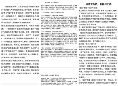 我院学子积极响应,踊跃参与,纷纷将自身推普经历融入创作:或细致梳理在乡村支教时推广普通话,为当地孩子打开知识视野的点滴变化;或深情讲述协助乡村商户用普通话对接外地客户,助力农产品走出大山的温暖故事;或记录参与社区推普志愿活动,帮助老年村民跨越“语言障碍”的难忘瞬间。大家以真挚的情感、生动的笔触完成作品,经学院专业评审筛选,12篇立意新颖、主题突出、充满乡土温度的优秀作品脱颖而出,已提交至校语委参与校级评比。