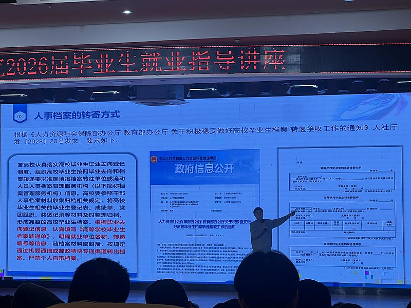 讲座中,向老师围绕毕业生就业核心关切点展开详细讲解。针对三方协议这一就业关键文件,向老师结合实例拆解填写规范、注意事项及法律风险,帮助学生理清协议签订中的重点难点;在人事档案转寄环节,他系统说明档案转寄流程、接收单位确认及常见问题解决方案,强调档案管理对职业发展的重要意义;关于中国铁路人才网注册,向老师现场演示注册步骤、信息完善要点及岗位查询技巧,为有意向投身铁路系统的学生提供精准指引;此外,他还从简历结构、内容提炼、亮点呈现等方面分享实用技巧,指导学生打造更具竞争力的个人简历。