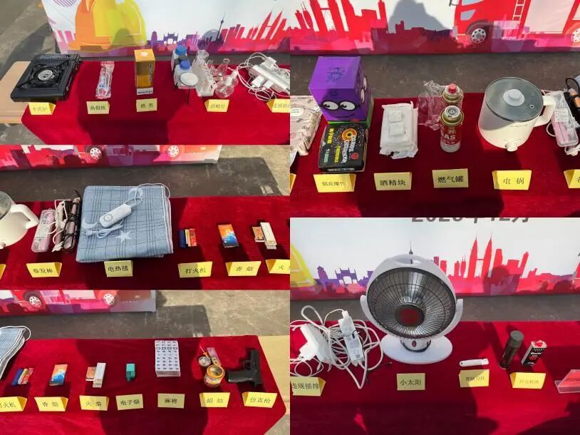 活动现场专设违禁品展示区,集中展出近年来学院宿舍安全排查中收缴的各类违规物品,涵盖大功率电器、明火器具、管制刀具及违规宠物用品等类别。具体包括易引发火灾的电炒锅、热得快、违规插线板、卷发棒,以及酒精灯、打火机等明火器具,还有水果刀、弹簧刀等具有人身安全隐患的刀具。每件展品均配有说明标识,清晰列明物品名称与风险隐患,帮助学生形成对违禁品的准确辨识与风险认知。