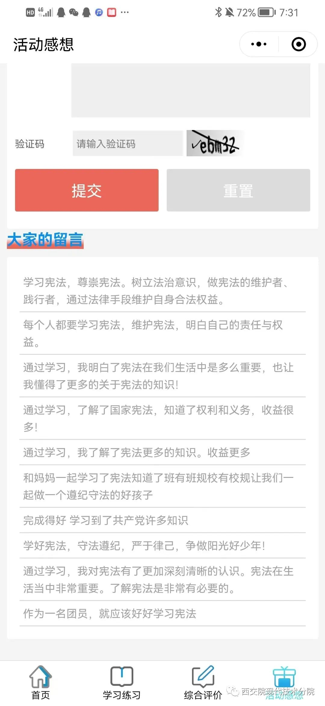 同时,各班辅导员指导学生通过普法网参加学习宪法线上自主答题活动并取得良好成绩,部分同学在答疑活动纷纷进行留言,表示要增添法律意识,提高法律素养,争做学法、懂法、知法、守法的时代青年,增加法律观念,让宪法深入内心。使同学们认识到法律无处不在、法律无时不在,提高了同学们守法的自觉性、遵法用法的积极性,树立良好法律风气,促进和谐校园的建设。