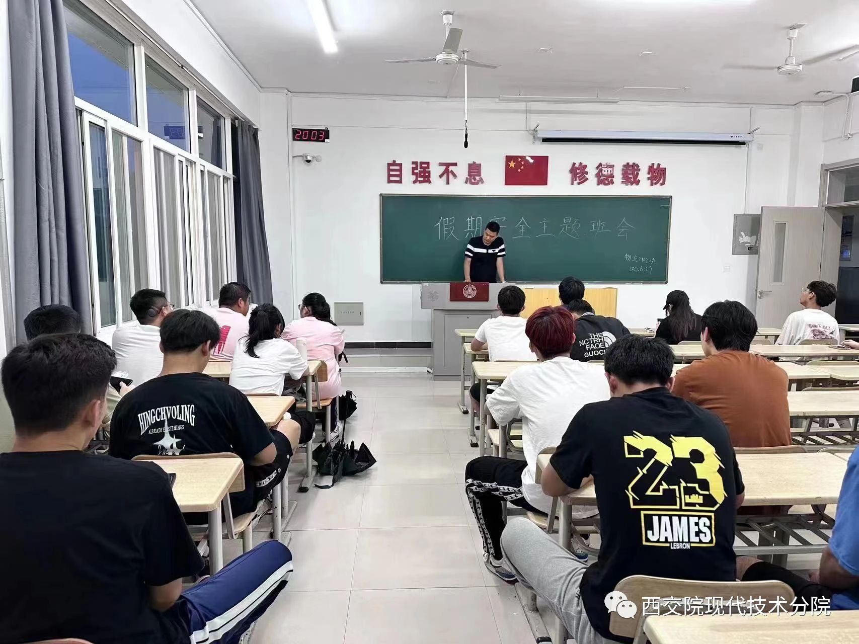 首先,各班辅导员向同学们说明假期间学校的具体安排,要求同学们重视假期安全问题,并重点介绍了防溺水、交通安全、防诈骗、消费安全等八大方面安全方面的知识,让同学们认识到在日常生活中防患于未然的重要性和生命的脆弱与可贵,及时为同学们敲醒了安全的警钟!。紧接着,各班主任针对假期宿舍安全问题,向同学们做出指示,大家理应按时返校,不可在外逗留,并做到宿舍卫生及时打扫,杜绝宿舍内吸烟、喝酒等违规行为。会议的最后,班主任带领同学们学习假期安全承诺书,向同学们强调,外出游玩时一定要注意饮食安全和交通安全,希望同学们度过一个安全而丰富的暑期假期。