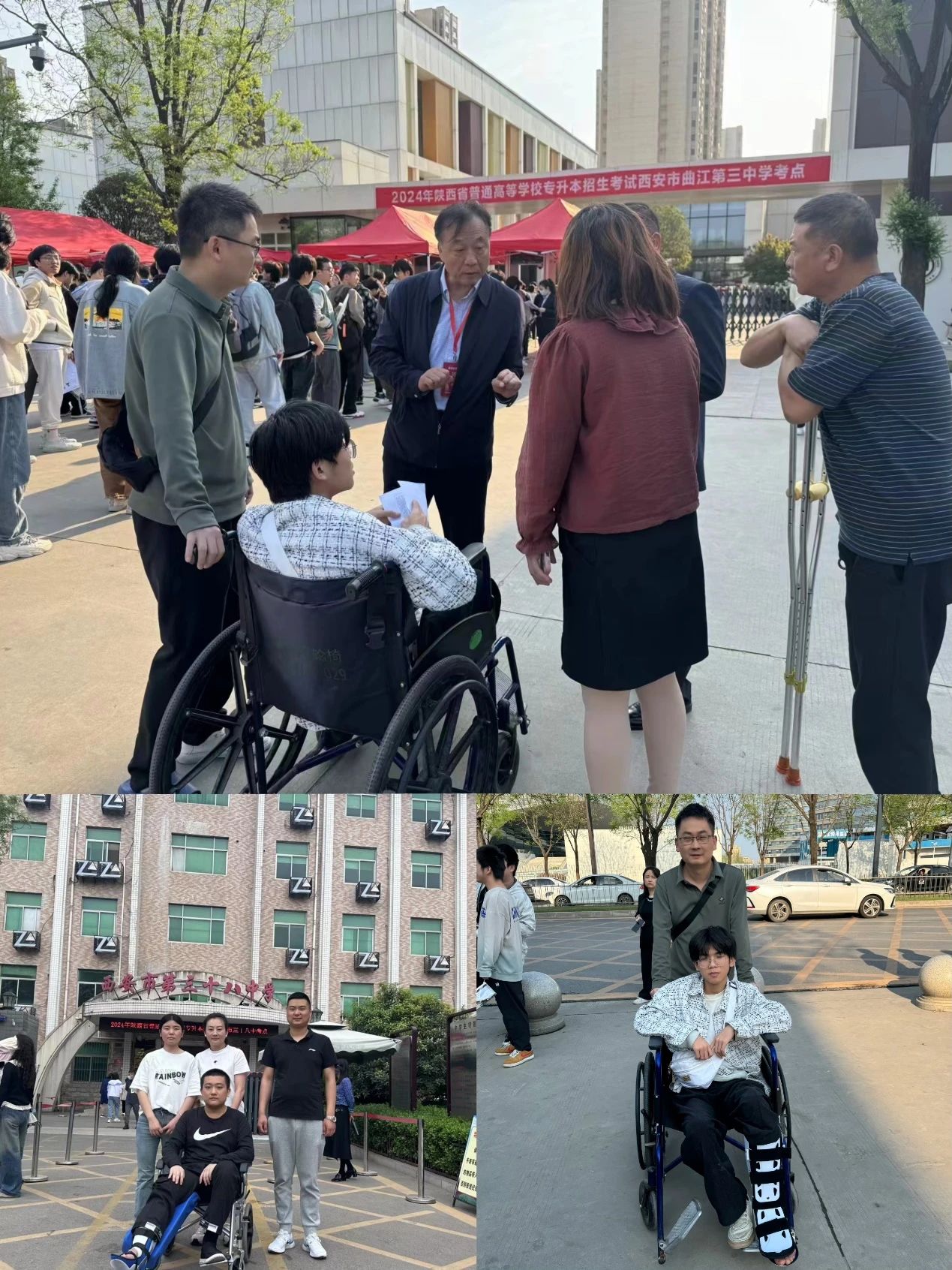 4月13日考试当天,又针对行动不便的两名考生,制定出行计划,沟通考场“绿色通道”,并安排了聂方山、周娜、郑舒方、王冲等四位老师分成两组帮助考生顺利进入考场参加考试。
