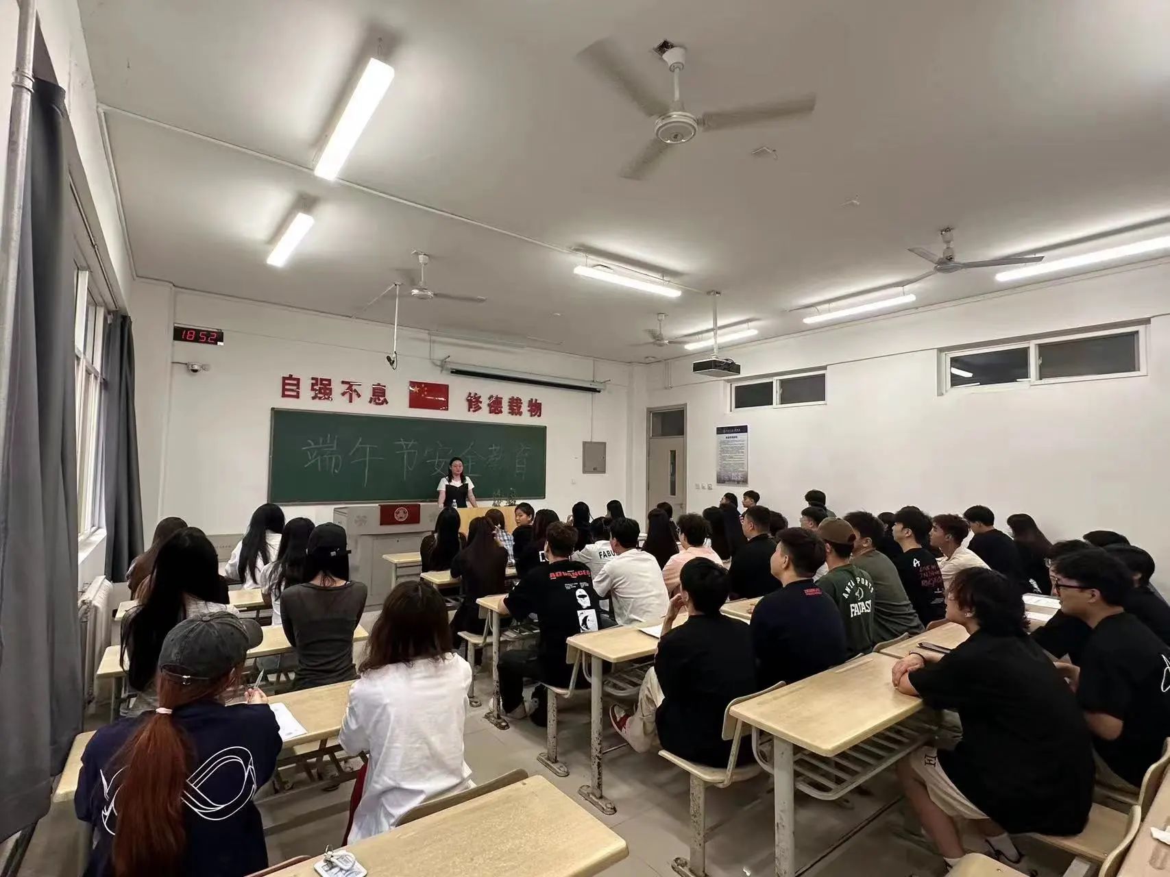 班会上各位辅导员老师从对学生生命财产、交通、食品、防溺水、防火、防盗、防骗等各方面的安全,展开对学生进行安全宣讲教育。1.教育学生拒绝乘坐无牌、无证、超载车辆及非法运营出租车、摩托车,谨防交通事故和人身财产意外伤害事故的发生;2.教育学生遵纪守法及注意网络、信贷安全,文明上网,不造谣、不信谣、不传谣;3.教育学生严禁到周边的湖泊、水库、河边玩水、游泳,注意防溺水、不野泳;4.提醒同学们假期外出要严格遵守交通规则,科学使用交通工具,保持清醒头脑,严防电信诈骗,预防意外事故发生,做到安全离校、平安返校。